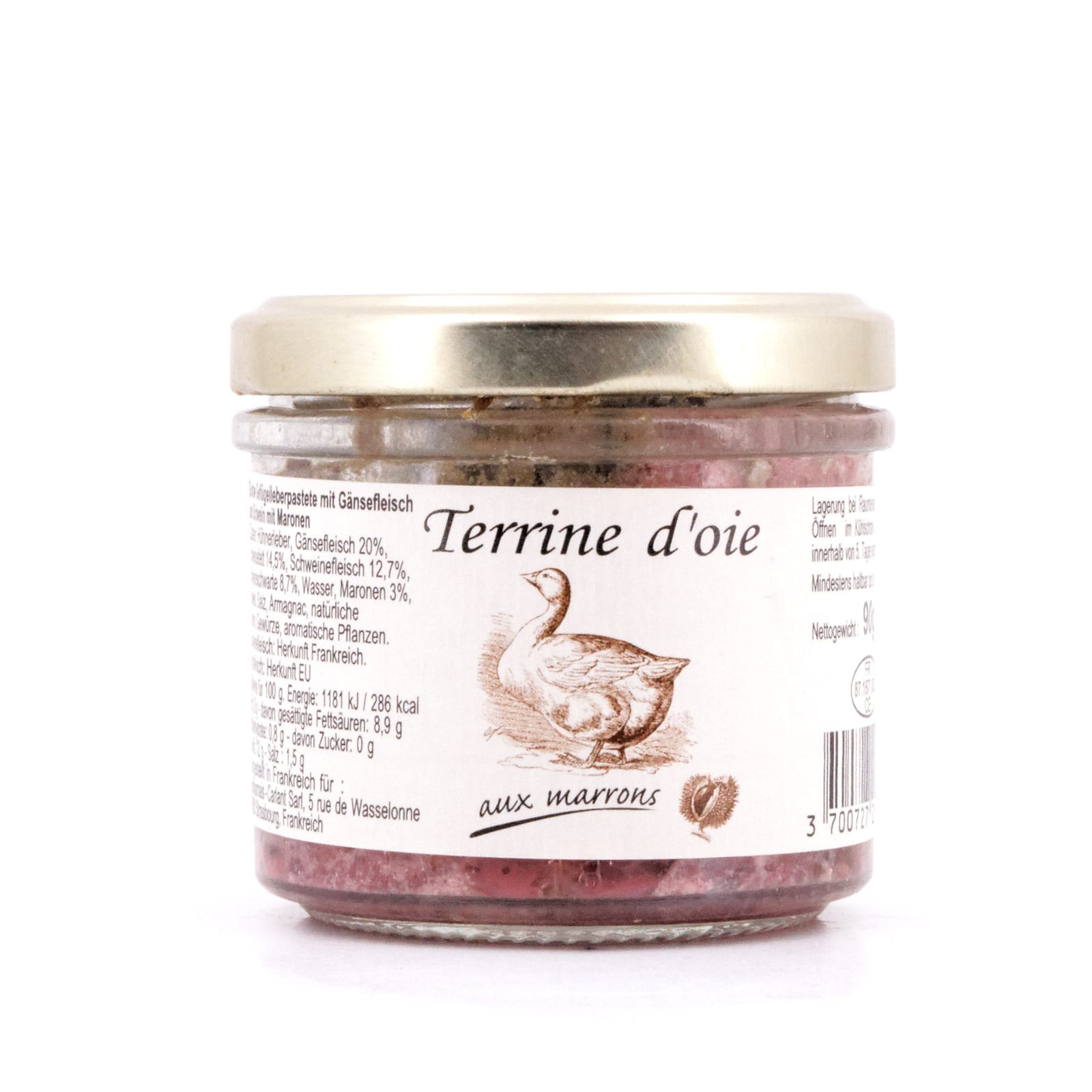 Hühnerleber, Gänsefleisch 20%, Schweinefett 14,5%, Schweinefleisch 12,7%, Schweineschwarte 8,7%, Wasser, Maronen 3%, Rotwein, Salz, Armagc, natürliche Aroma, aromatische Planzen, Gewürze