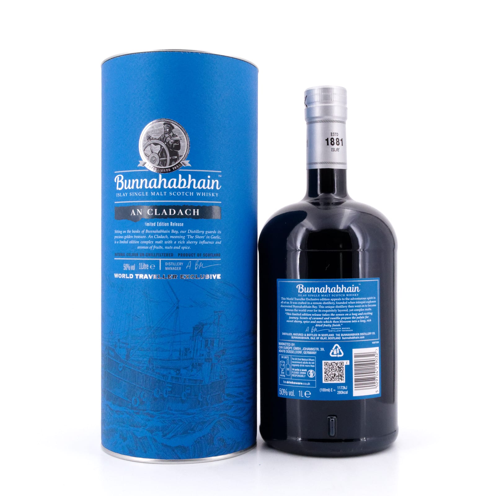 Die Abfüllung des „Bunnahabhain An Cladach“ – zu Deutsch in etwa „die Küste“, gehörte ursprünglich zum Travel Retail-Sortiment in dessen Reihe „World Traveller Edition“. In Batches jährlich abgefüllt in limitierter Ausgabe ist dieser Bunnahabhain von allen derzeit im Sortiment befindlichen Abfüllungen die am deutlichsten von Sherry-Fässern geprägte. Nicht kühlfiltriert und ungefärbt mit kräftigen 50 Vol% Alkoholgehalt.
