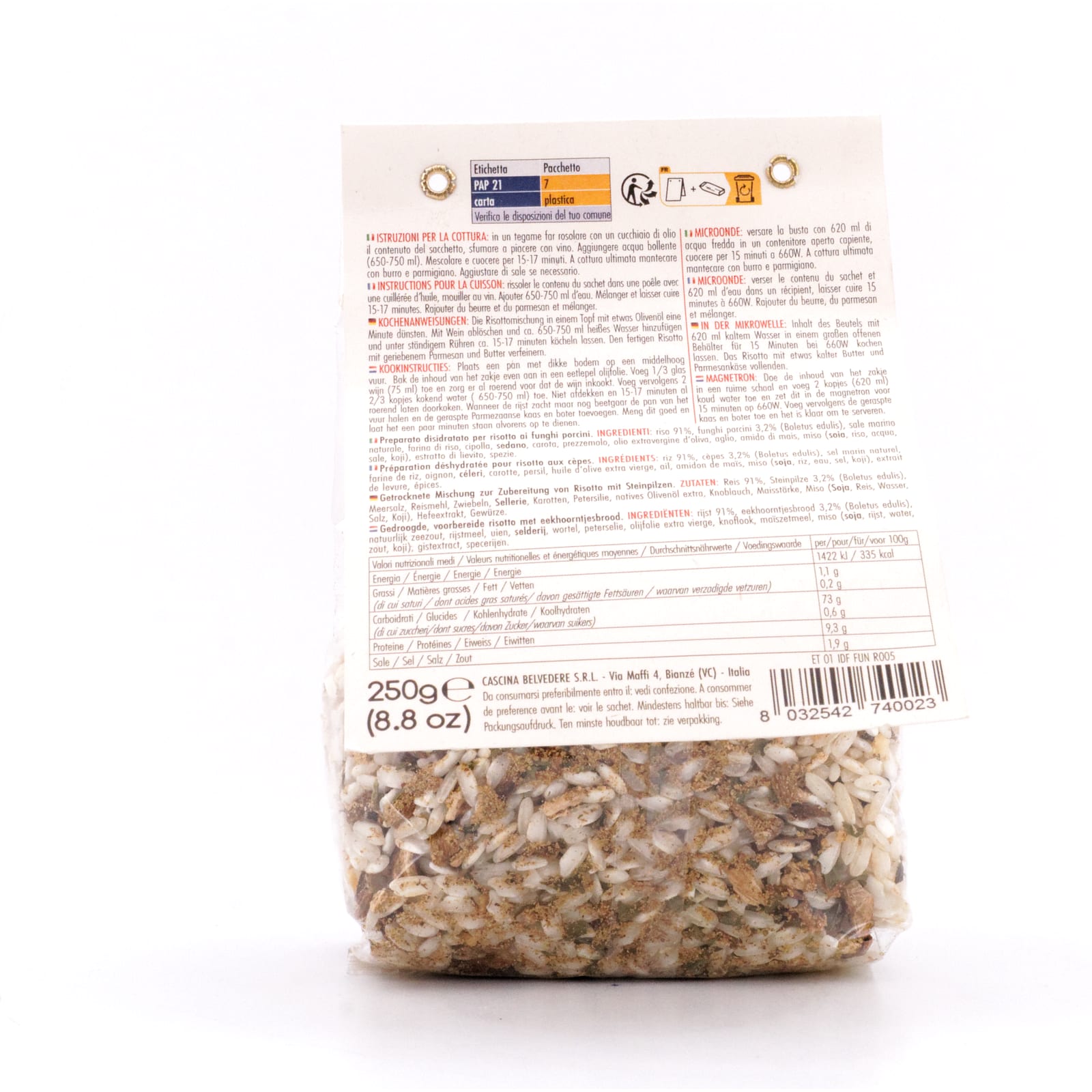 Den Beutelinhalt mit 620 ml kaltem Wasser in einem Behälter verrühren und für 15 Minuten bei 660 W kochen. Den fertigen Risotto mit geriebenem Parmesan und Butter nach Belieben verfeinern, fertig! Guten Appetit!