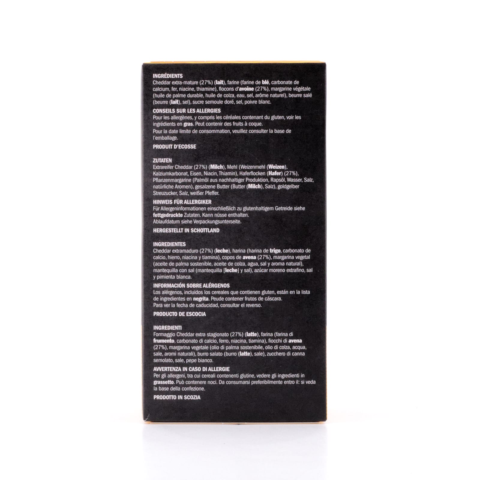 Zutaten: Extrareifer Cheddar (27%)(Milch), Mehl (Weizenmehl (Weizen), Kalziumkarbonat, Eisen, Niacin, Vitamin B1, Haferflocken (Hafer) (27%), Pflanzenmargarine (Palmöl aus nachhaltiger Produktion, Rapsöl, Wasser, Salz, natürliche Aromen), gesalzene Butter (Butter (Milch), Speisesalz), goldgelber Streuzucker, Salz, weißer Pfeffer.