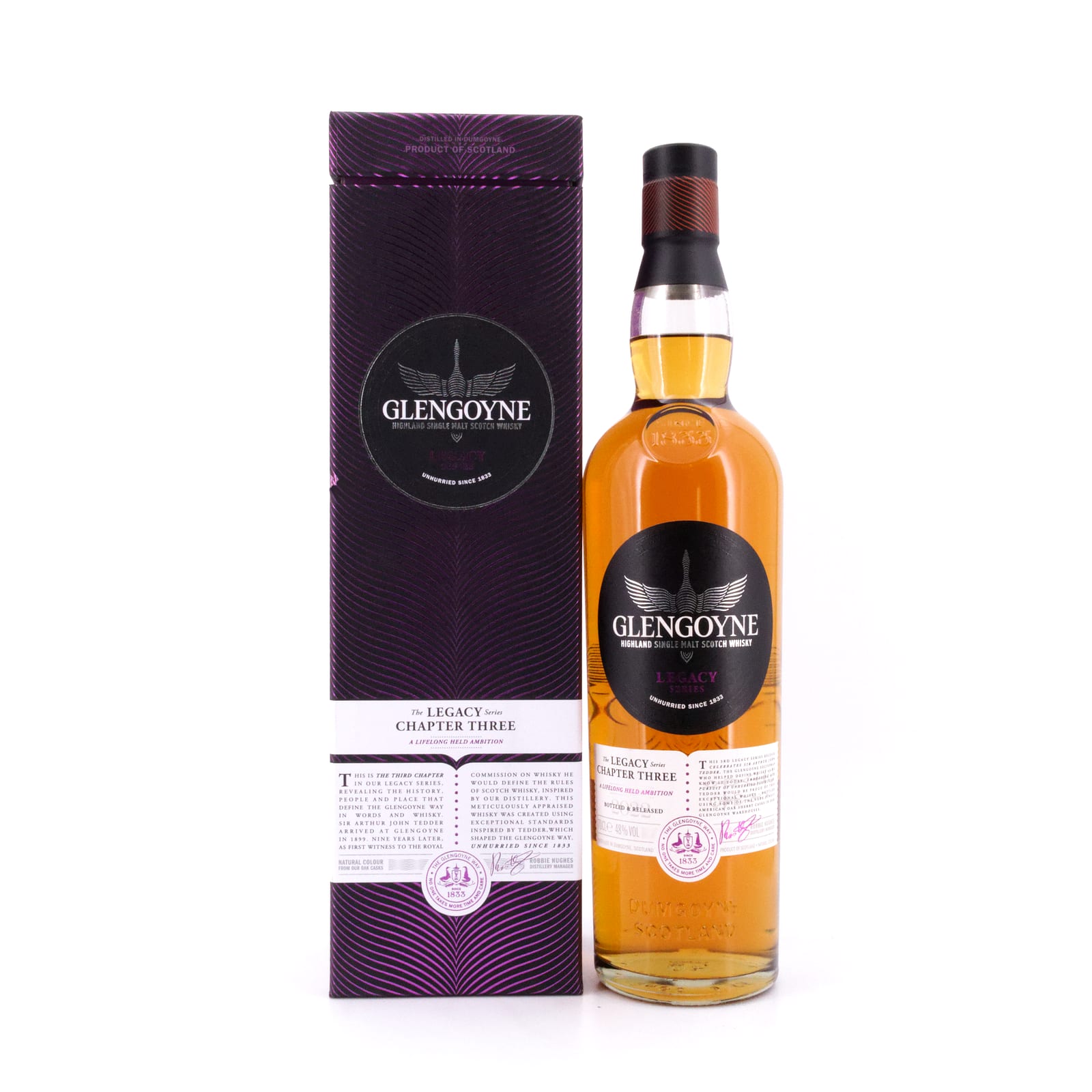 Dieser Single Malt markiert den abschließenden Teil der dreiteiligen Legacy-Serie der Glengoyne Brennerei aus den schottischen Highlands. Er wurde als Hommage an Sir Arthur John Tedder kreiert, dem Zollbeamten der Brennerei, der auf dem Firmengelände residierte und 1908 Mitglied der königlichen Whiskykommission war. Diese Kommission legte die Kriterien fest, nach denen Scotch als solcher verkauft werden durfte.