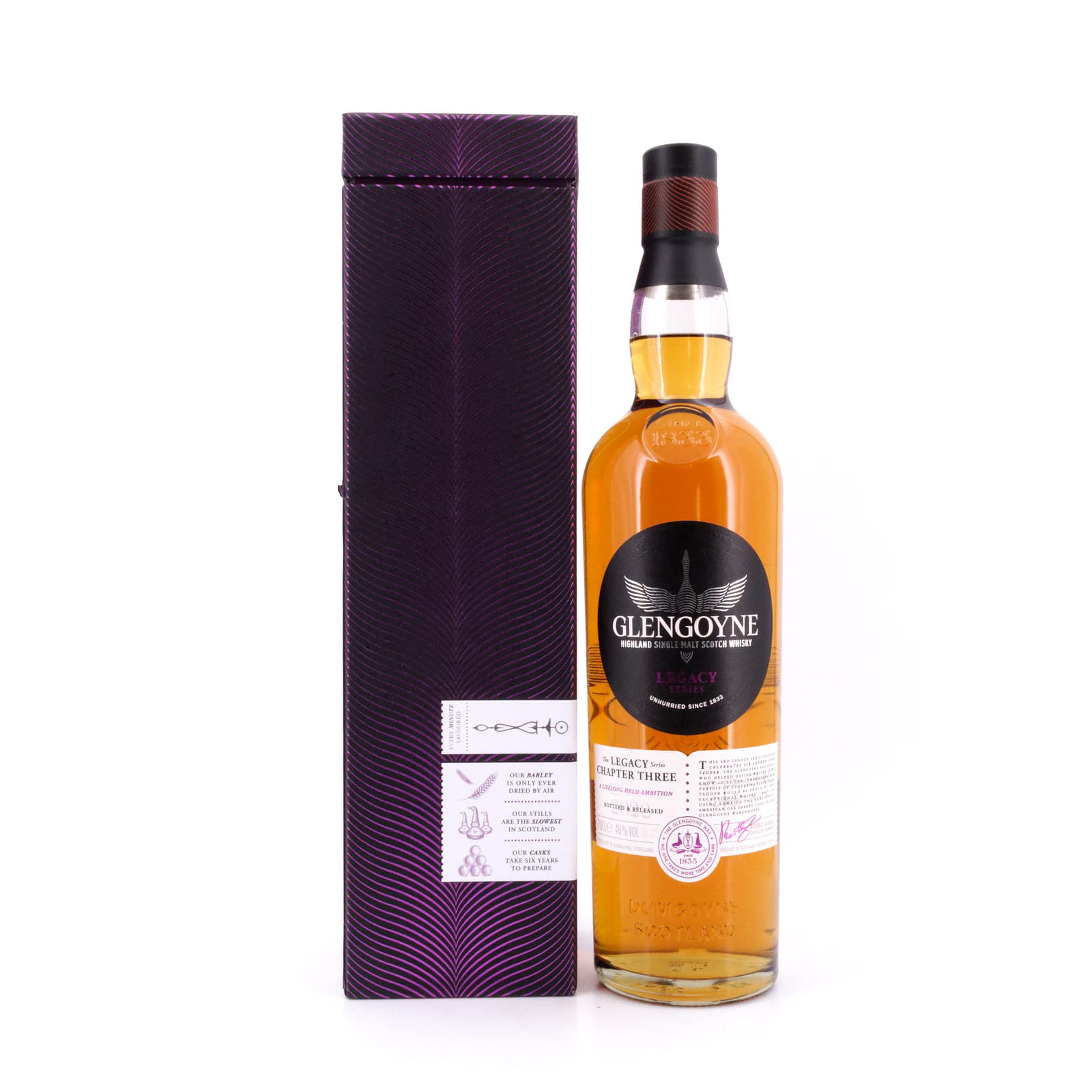 Der Glengoyne Legacy Chapter Three Single Malt reifte in ehemaligen Sherryfässern aus amerikanischer Weißeiche, die den charakteristischen Aromen dieses Whiskys prägend beeinflussten.