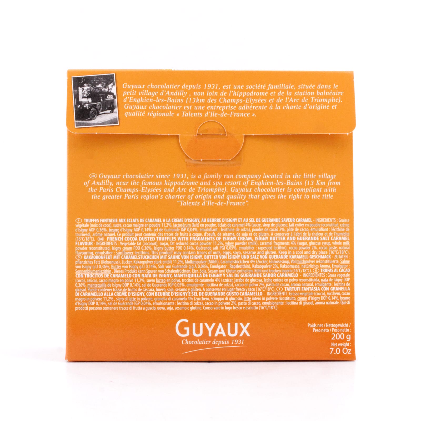 Heute umfasst das Portfolio ein breites Spektrum an Confiserie, darunter die berühmten Trüffel „Guyaux Truffes Fantaisie“. Die Variation hier, die „Guyaux Truffes Fantaisies aux Éclats de Caramel d‘Isigny“ bringt zwei französische Spezialitäten zusammen: Die zart schmelzende Schokolade von Guyaux mit dem berühmten „Caramels d’Insigny“, einer Karamell-Spezialität aus der Normandie. Die Salzbutter des Karamells macht diese fein-knusprige Schokoladen-Spezialität zu einem geschmacklich ganz besonderen, fein-würzigen Highlight, das Ganze noch dazu umhüllt von zart duftendem Kakao.