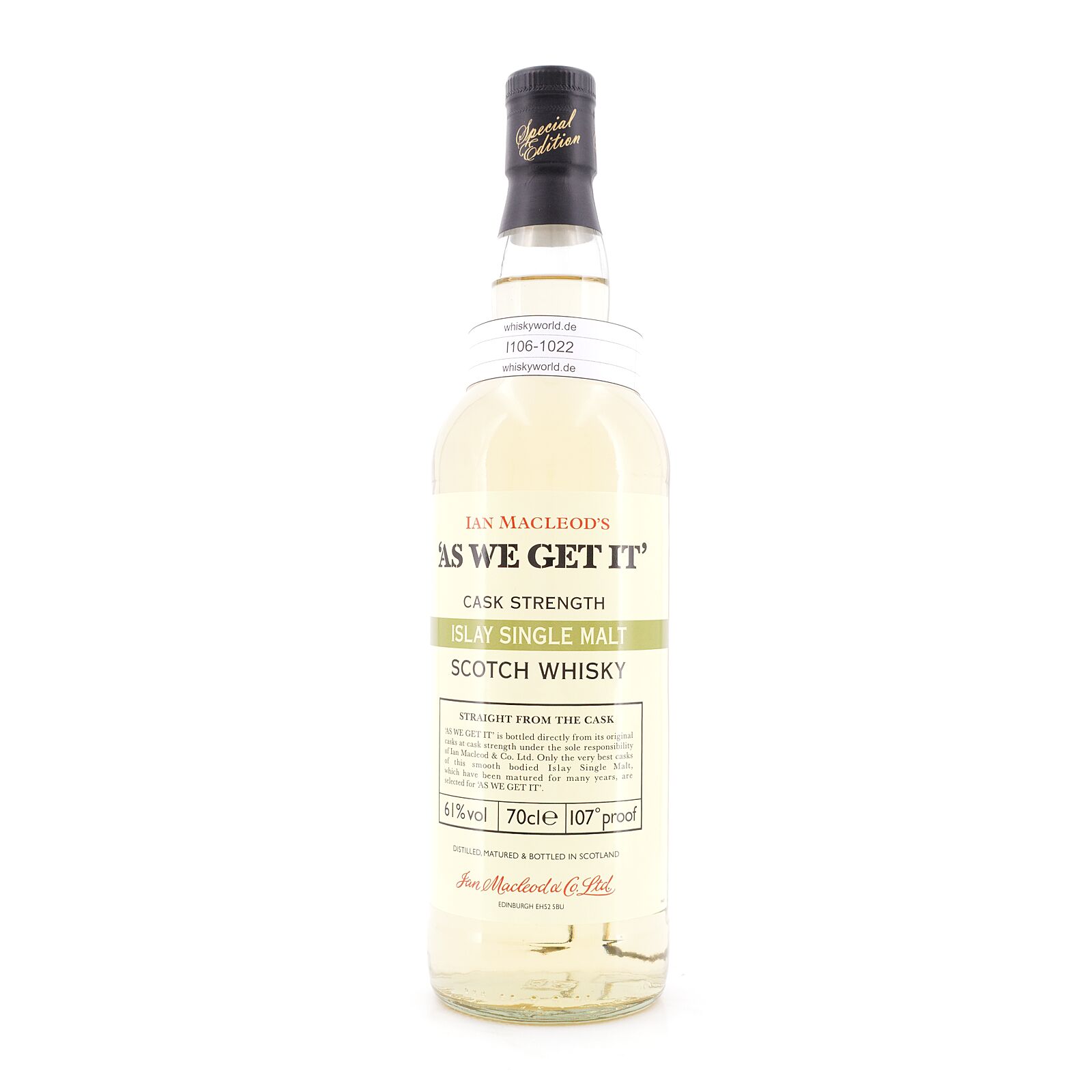 Die Reihe „As We Get It“ füllt Whisky aus dem Fass, ohne Kühlfiltration, ohne Färbung, ohne Verdünnen direkt in die Flasche. So wie man bei „Ian Macleod Distillers“ das Fass bekommt, füllt man es in Flaschen um und gibt es an seine Kunden weiter. Damit gleicht kein Fass dem anderen, so sind auch keine zwei Abfüllungen gleich und wechseln in Farbe, Geruch, Geschmack und Abgang. Dieser Islay Single Malt wurde in Fassstärke mit 61,3 Vol% abgefüllt.