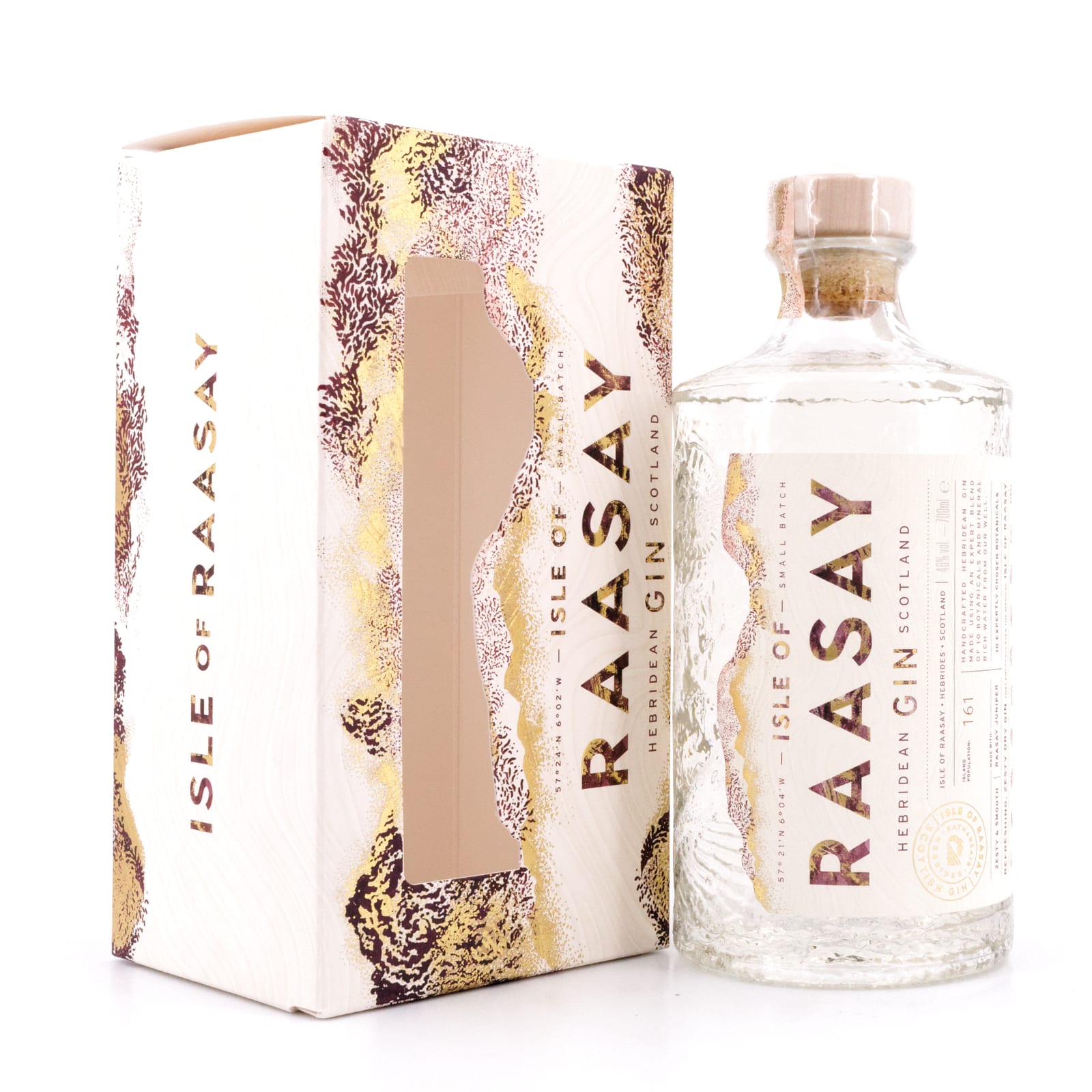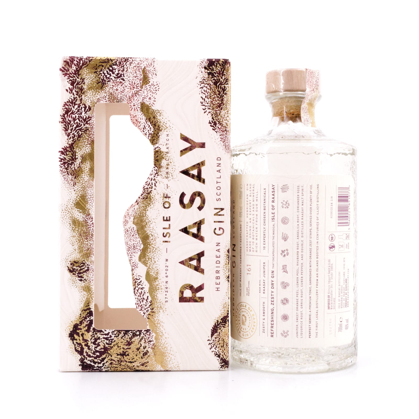 Basis für diesen Insel-Gin ist der dreifach destillierte Rohbrand der Raasay Destillerie, der aromatisiert wird mit zehn verschiedenen Kräutern, u.a. direkt von der Insel selbst. Der Raasay-Wacholder und ein Teil der Kräuter und Gewürze werden mitdestilliert, der Rest wird vapor infused: Hier werden Alkohol und Wasser erhitzt, der entstehende Dampf wird durch ein Kupfer-Körbchen geleitet, das die Kräuter und Gewürze enthält, deren Aromen der durchziehende Alkohol-Dampf dann aufnimmt. Zu den Aromen-Gebern zählen hier Wacholderbeeren (Juniperus), Rhabarber (Rheum rhabarberum), Zitronen- und Orangen-Schalen, Koriandersamen (Coriandrum sativum), Angelika-Wurzeln (Angelica archangelica), Süßholz (Glycyrhizza glabra), Iris-Wurzel (Rhizoma iridis) und Kubeben-Pfeffer (Piper cubeba).