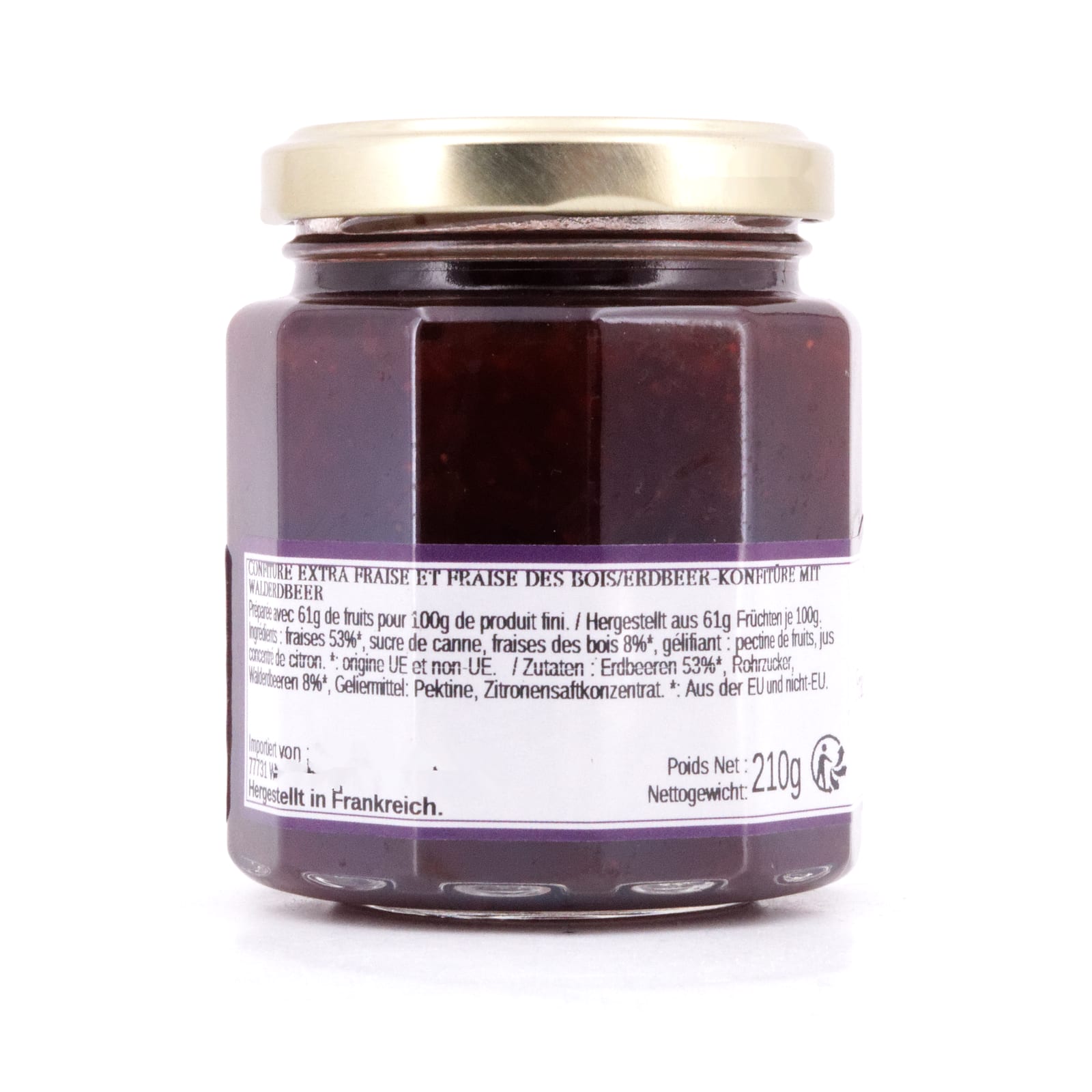 Erdbeeren 53%*, Rohrzucker, Walderdbeeren 8%*, Geliermittel: Pektine, Zitronensaftkonzentrat.